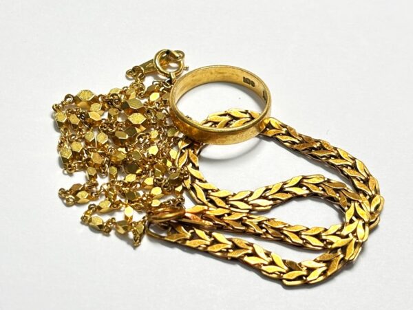 本日ご紹介するのは、黄金の輝きを放つ、K18(18金)のリングとネックレスでございます。金相場が歴史的な高水準を維持している今、これらのお品物はまさに時を超えて価値を増し続ける確かな資産でございます。かつて大切に身に着けられていたお品や、ご家族から受け継がれた特別な想い入れのある貴金属など、広島金買取最高額ドットコム福山店にお任せ下さい。